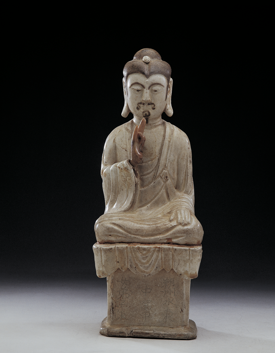 佛像高肉髻,眉间有白毫,双现时视,有须,两耳垂肩,结跏趺坐于须弥座上。通体施青白釉,髻与眉、眼、须绘褐彩。须弥座三面刻字。