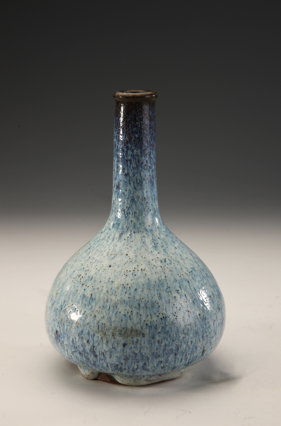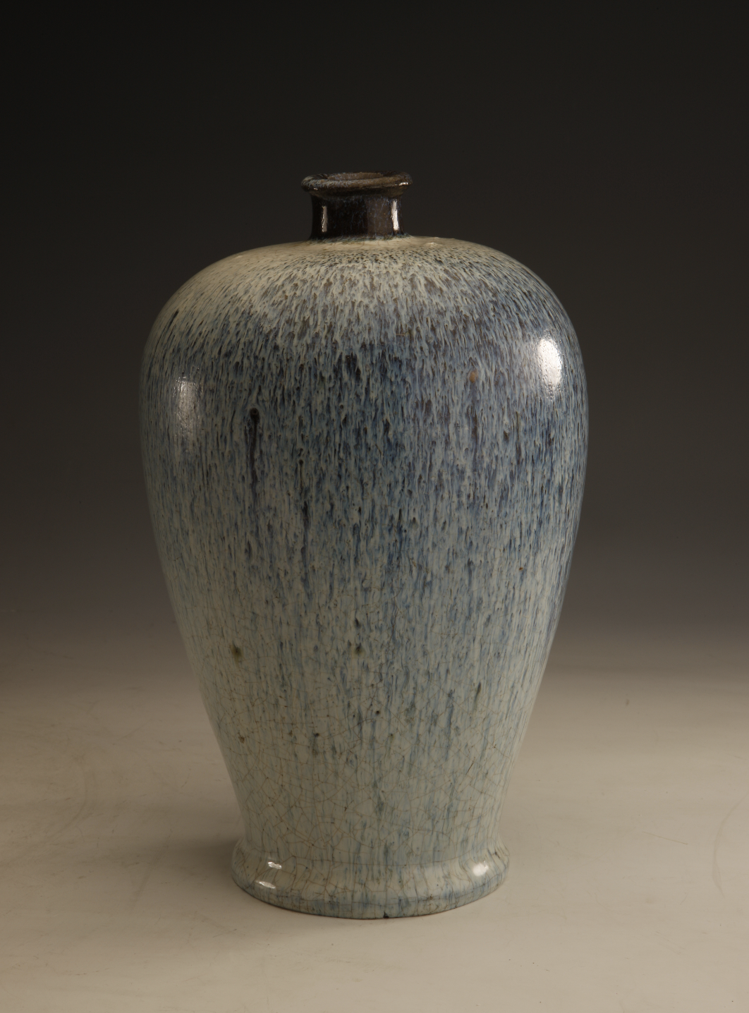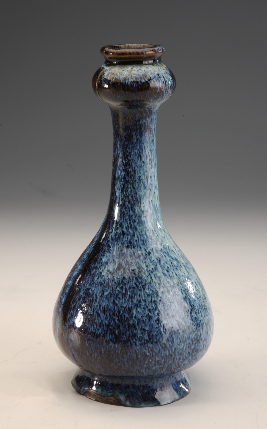 小唇口,短颈,丰肩,圆腹至足部渐收,圈足稍外撇,打磨光滑。棕色陶胎,甚鉴定。全器满施仿钧蓝色变釉,釉厚处呈月白色,釉面有狭窄开片。底部无釉,有旋削痕。此瓶有元代遗凮,为石湾窑明代早期艺术陶器珍品。