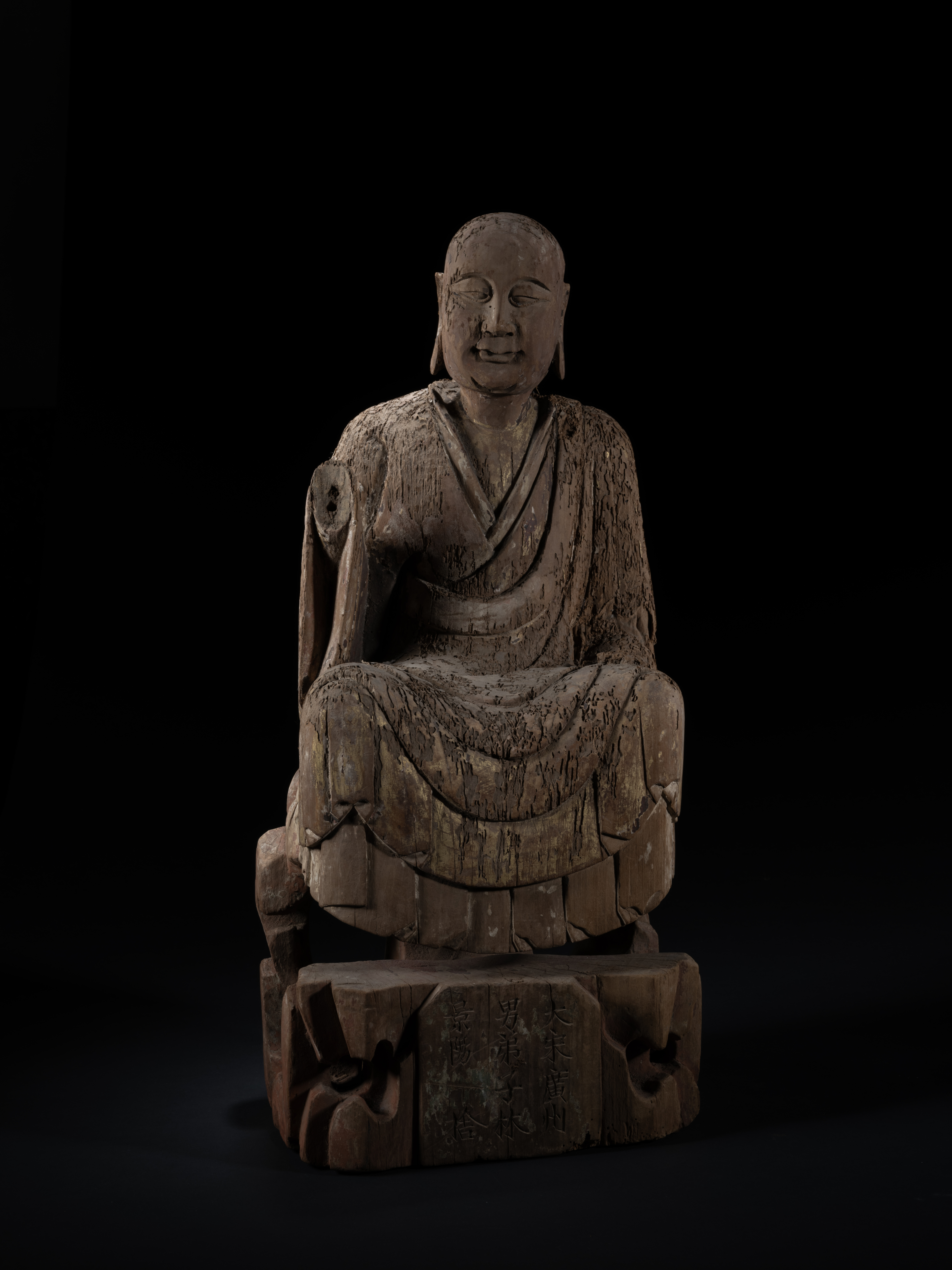 善跏趺坐,正首,脸方圆,模样严肃,双手向下合十置于腹前。座透雕,正面刻有“皇宋庆历七年丁亥岁,广州男弟子林士明囗”。从铭文可知,这尊罗汉像与北宋庆历七年(即公元1047年)广州的林士明密切关连。北宋木雕工艺深湛,领有极高的艺术价值。此尊罗汉像经受写实手法描摹,刀法利落矜重,每个细节无一不体现出工匠考究的身手。