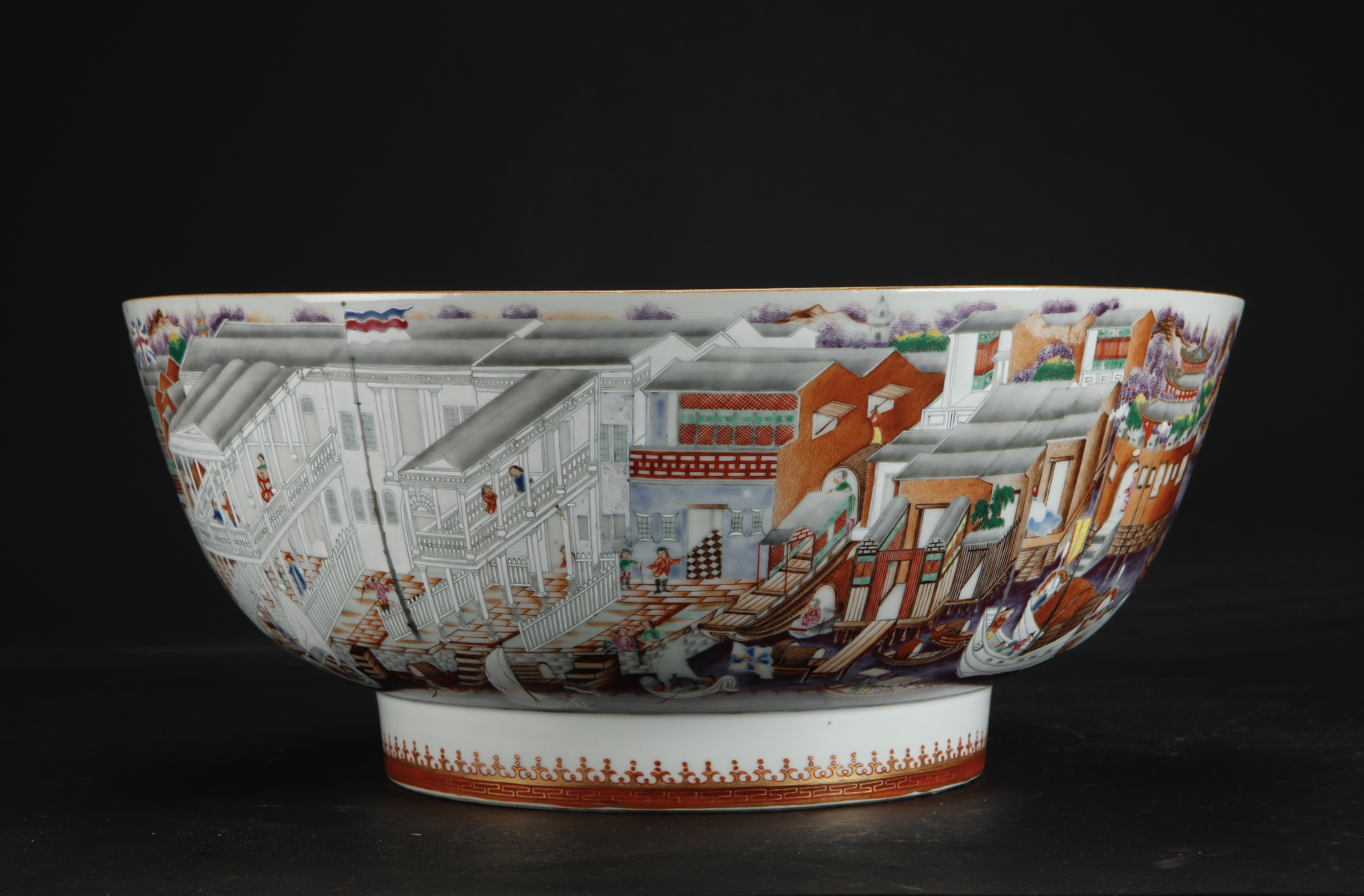 该大碗圈足外壁一圈锋芒状边饰窒碍,碗里面中央绘有一个花篮。这种大碗是欧洲东说念主在宴集上调盛果酒之用,也称潘趣碗。外壁以通景彩绘方式描画了广州十三行商馆的面庞,上头绘有丹麦、大立异前的法国、奥地利、瑞典、英国和荷兰的国旗,还有炮台、粤海关以及无数的划子、船夫、正在言语的中外商东说念主、包装和搬运茶叶的气象、装车舢板等场景,是乾隆时间一件不能多得的杰作之作。