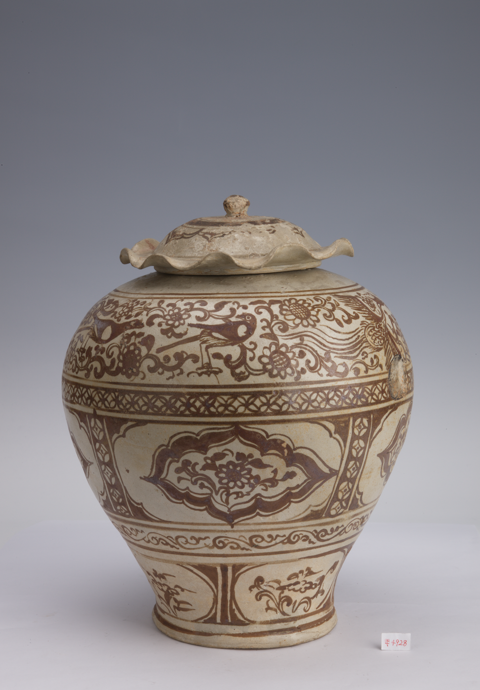 元雷州窑釉下褐彩凤鸟纹荷叶盖罐