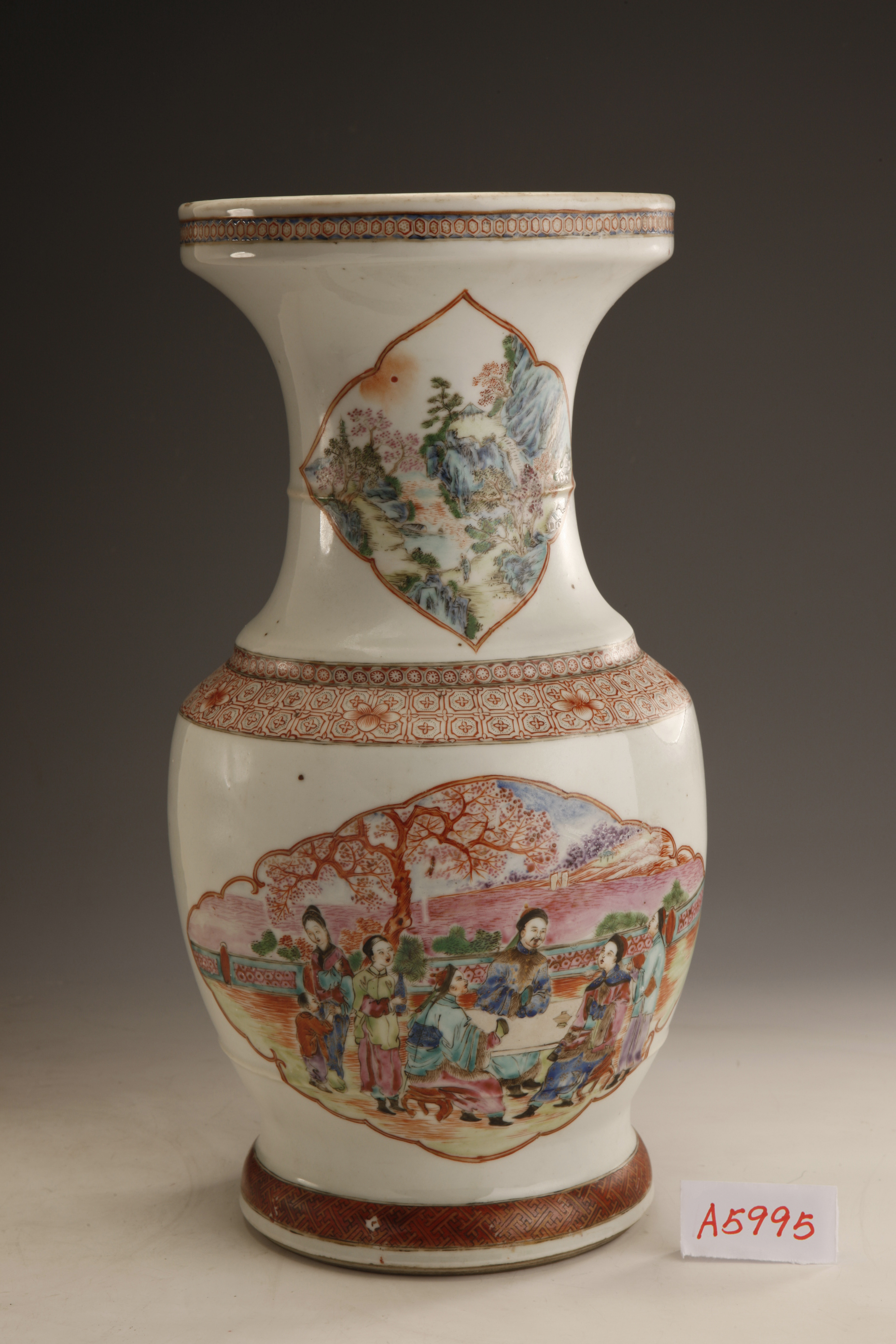 盘口,束颈,弧形腹,足部稍外撇。口沿以蓝彩、墨彩、矾红、描金绘龟背锦地边饰一周。颈部前后两个对称菱形开光,开光内绘山水形式图。肩部略凹,以墨彩及矾红绘两层锦地带状纹饰,表层为带点顶真纹锦,基层为八角添花锦。