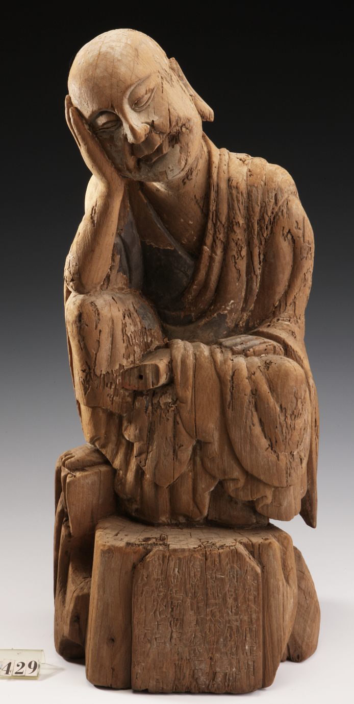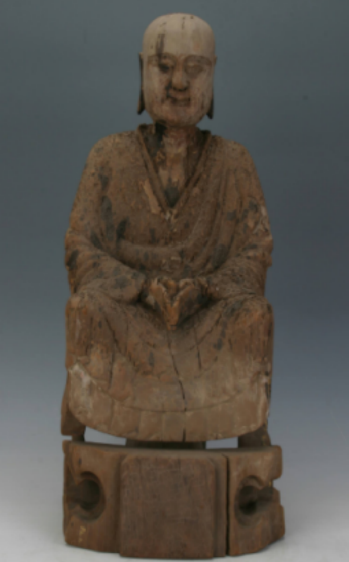 游戏坐,右足踏座,左足平趺,头右侧,右手托面,屈置右膝,左手当然扬弃。这尊罗汉像很有特色,它的铭文前半部分保留了宋代铭文的本体,后半部分记录了明代重妆的史实。从铭文可知,北宋庆历八年(即公元1048年)广州的谭一娘出资捐造这尊罗汉像,在明代的时候有两次重妆。此尊罗汉像造型活泼传神,雕造立场强大质朴,号称中国宋代木雕工艺的典范之作,亦然中国佛造像玩忽的规律器。