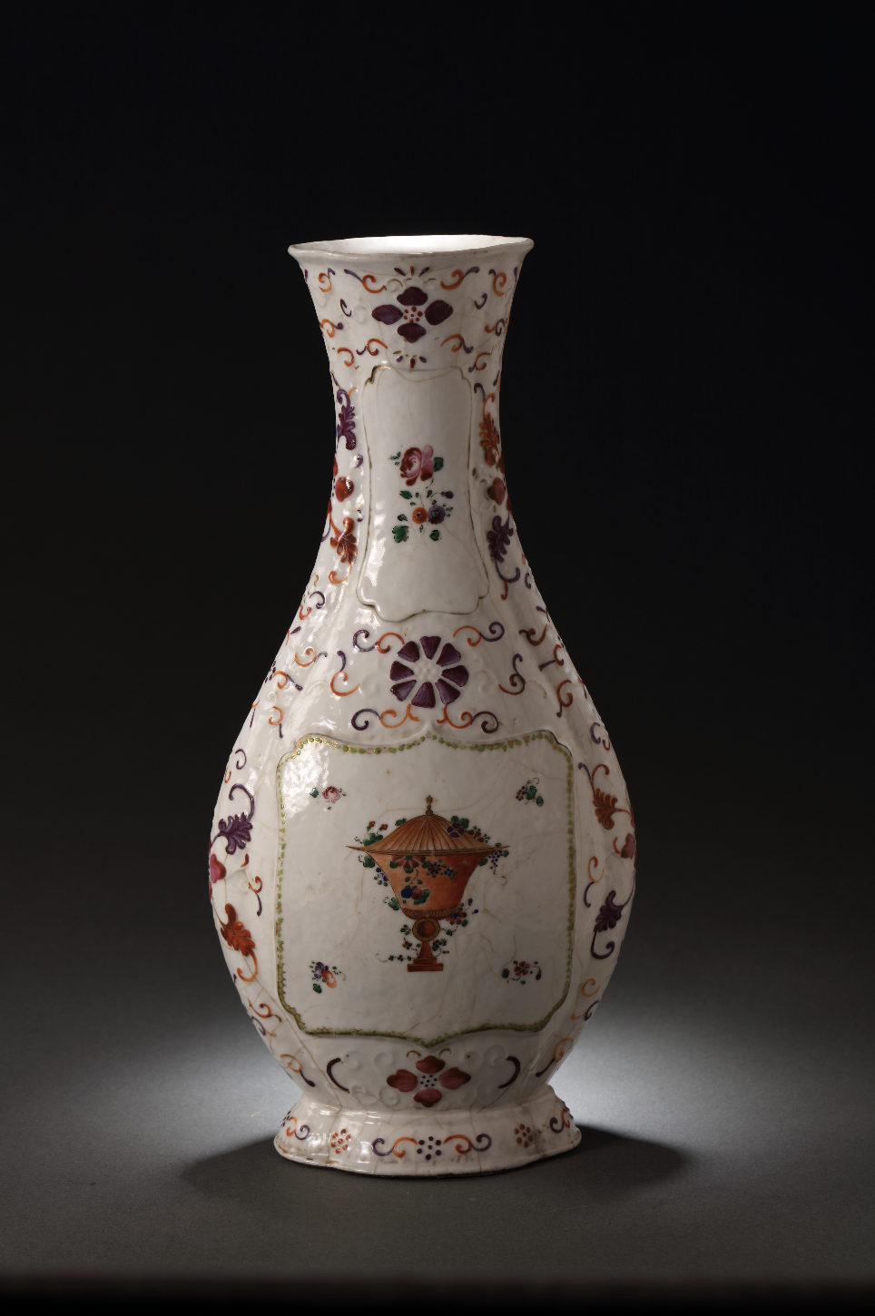 四瓣花口,长颈,四瓣瓜棱形扁腹,撇圈足。瓶身多处模印了得卷曲斑纹,窒碍颇具“洛可可”立场。颈部委角开光内绘一枝欧好意思折枝花草。此瓶是早期广彩瓷器的杰作。