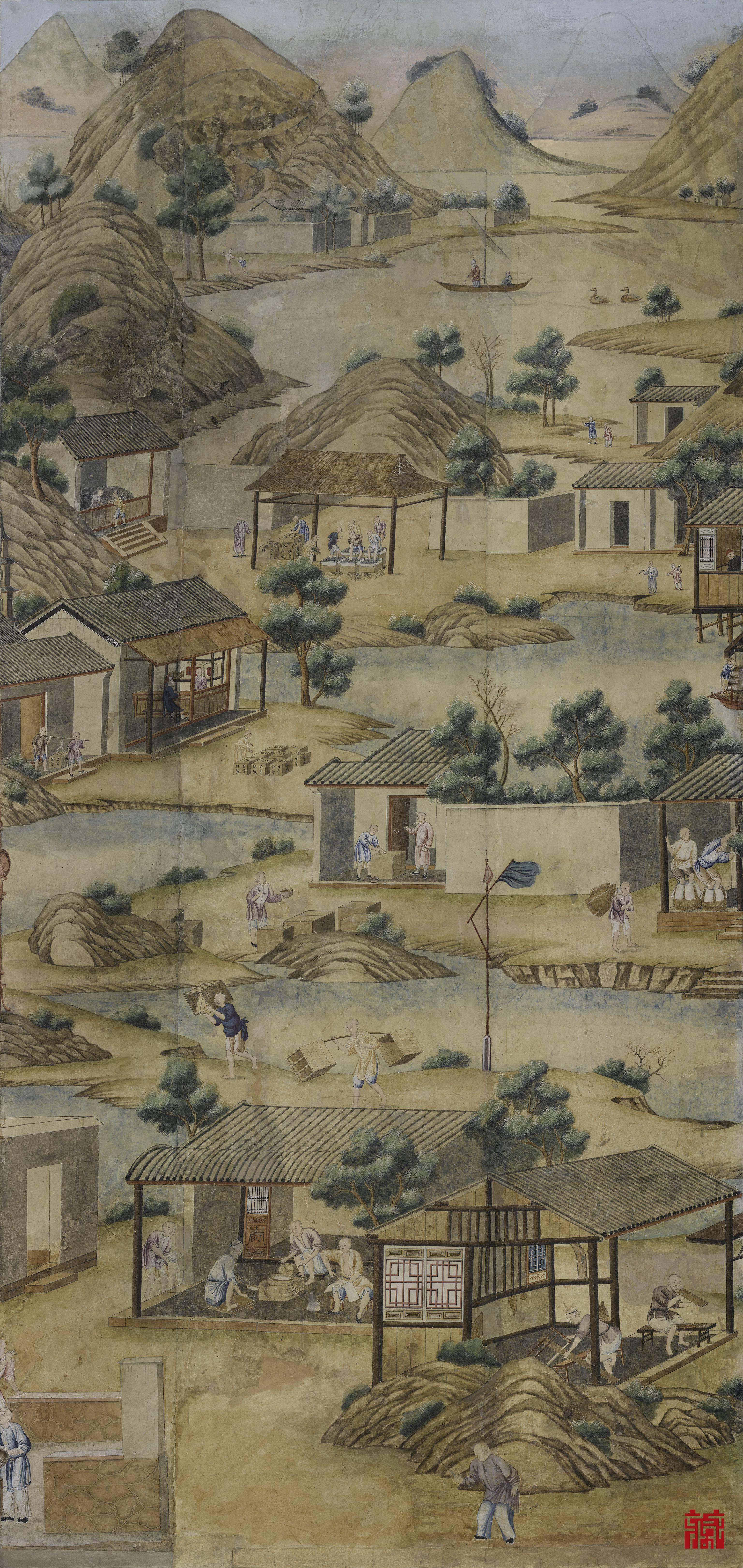 这套壁纸诚然每幅画面题材各不疏导,但拼起来是一组竣工的水乡稻作、茶叶买卖的广州风土情面写实画。既是那时外售壁纸中的佳作,亦然清代早期中英商贸文化交流的报复历史见证。