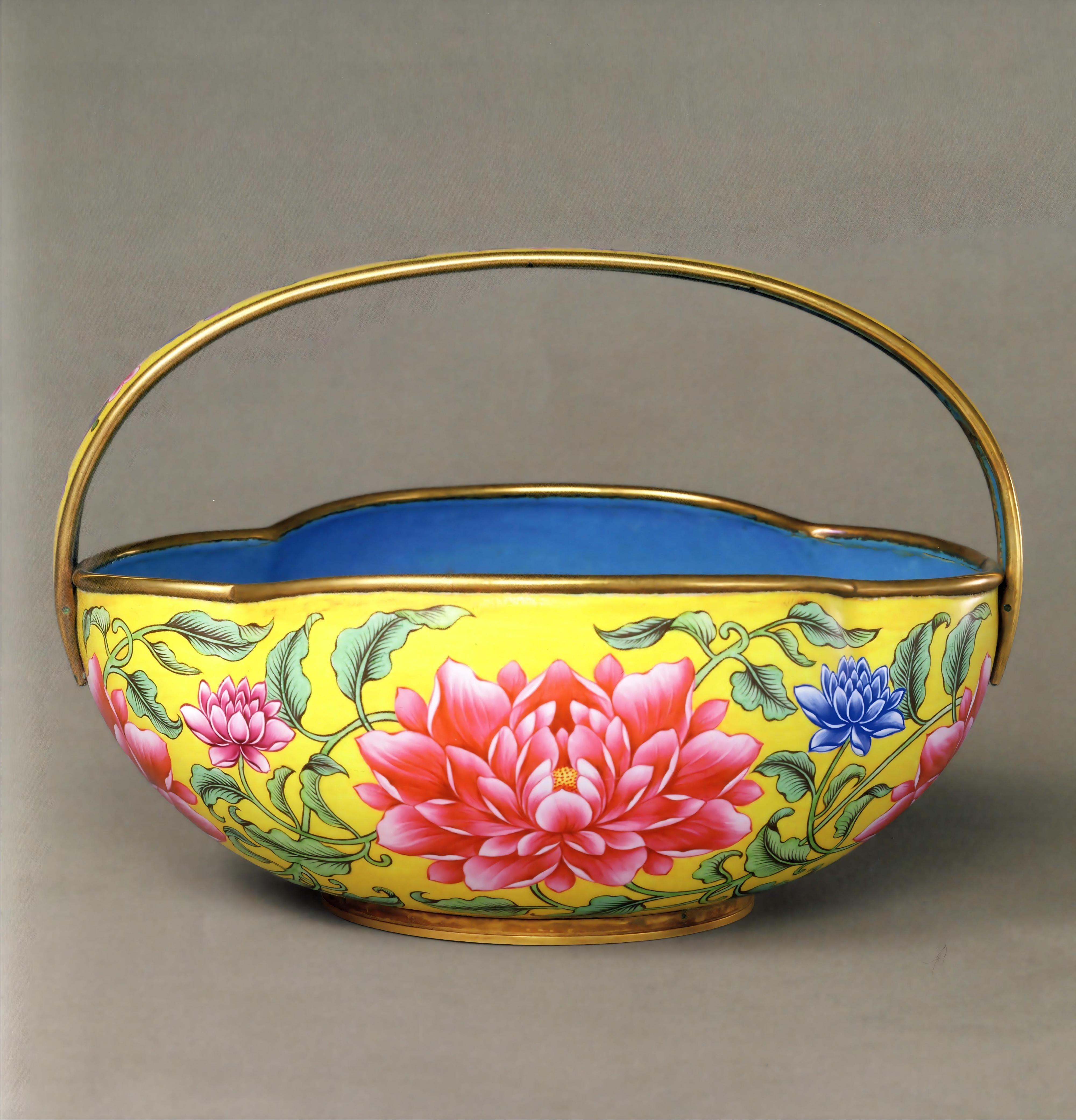 清乾隆四十年(1775)十一月乾隆帝命东说念主将十件康熙、雍正款画搪瓷器送到广州,条目粤海关官员仿制这些器物并落“乾隆年制”款识。于是,粤海关官员将器物画样后,把样稿交由法国及广州腹地制作。制作完成后,十件提档器物及制作的器物被送回宫廷。此花篮即为法国依据粤海关样稿制作而成。