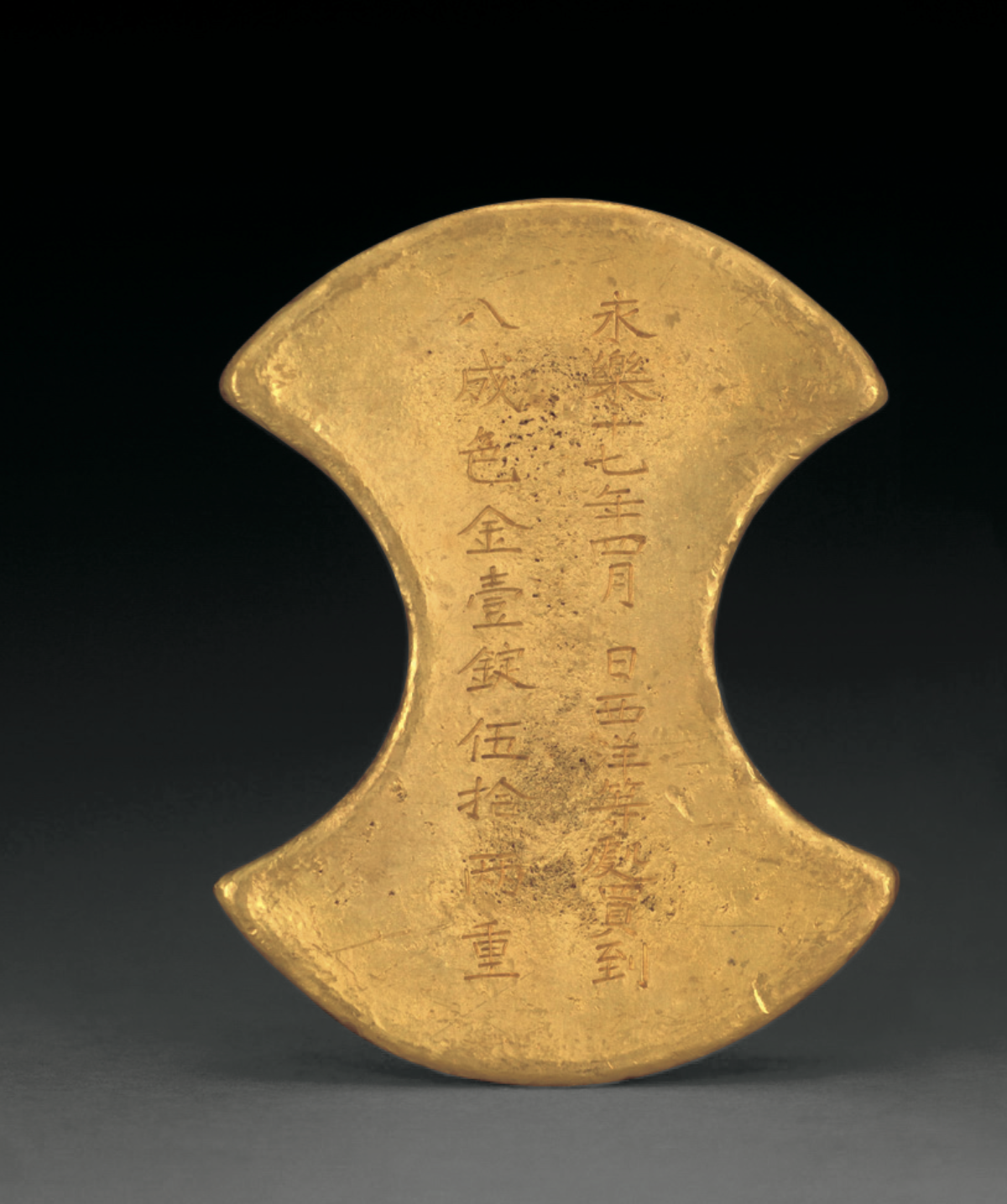 金锭2002年出土于湖北省钟祥明代梁庄王墓,正面铸有“永乐十七年四月 日欧好意思等处买到/粗略色金壹锭伍拾两重”铭文。永乐十七年是1419年,恰是郑和第五次下欧好意思操心之时,从铭文可知,这件金锭是郑和船队于复返途顶用在欧好意思所买的一批黄金制作的。“欧好意思”是那时泛指明朝南海以西的海洋,包括印度洋过甚沿海地区。