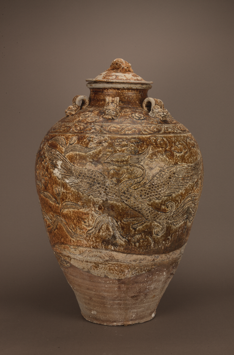 明万历磁灶窑酱釉堆塑双凤纹六狮系陶盖瓮