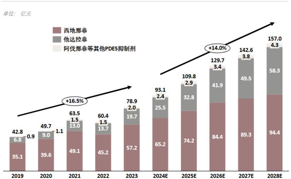 联系数据知晓,2019-2023年,中国抗ED药物行业范围已从42.8亿元快速增长到78.9亿元,年复合增长率约为16.5%,瞻望2024-2028年将从93.1亿元进一步增长至157亿元。