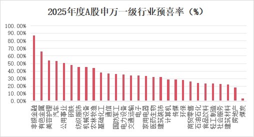 与上风赛说念的杰出表现造成昭着反差的是,诸多传统行业正深陷事迹承压的逆境,转型与解围成为其中枢课题。房地产、光伏、煤炭等多个传统赛说念堕入深度诊疗,事迹预亏、增速下滑成为行业常态,这也突显出新旧动能调遣经过中,传统行业靠近的转型阵痛与产能出清压力。从预喜率来看,煤炭和房地产行业预喜率不及20%,表现最为低迷;二级行业层面,焦炭、体育、林业、白酒等行业预喜率均为0%,而贵金属、证券行业预喜率则达100%,造成了顶点分化的行业格式。