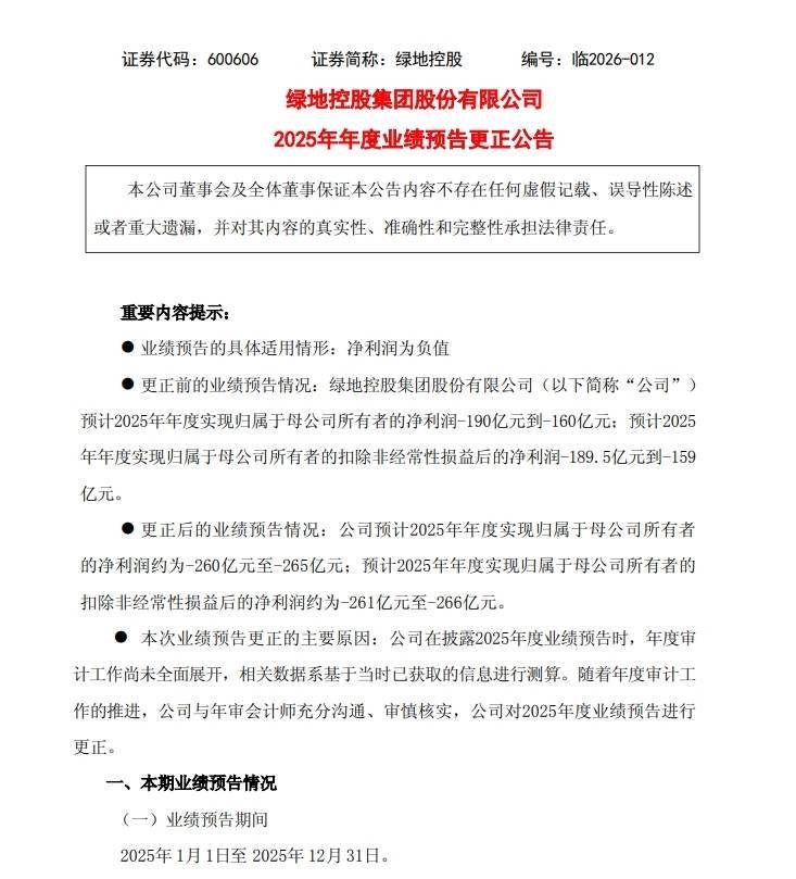 4月21日盘后,绿地控股瞬息发布一则修正2025年年度事迹预报的修订公告。绿地控股在公告中提到2025年瞻望净利润为-260亿元至-265亿元。公司原瞻望净利润为-160亿元到-190亿元。本次事迹预报修订,绿地控股给出的讲明是公司在裸露2025年度事迹预报时,年度审计责任尚未全面伸开,关联数据系基于其时已获得的信息进行测算。跟着年度审计责任的激动,公司与年审管帐师充分一样、审慎核实,公司对2025年度事迹预报进行修订。