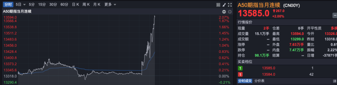 A50期货指数直线拉升,范围发稿,涨幅为2%。